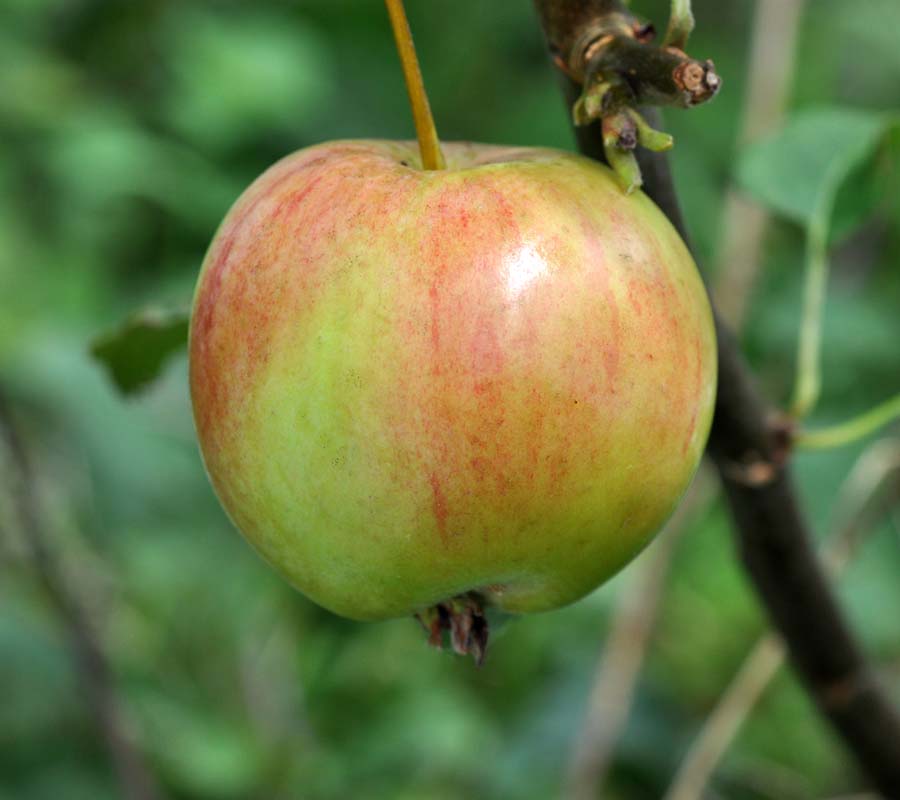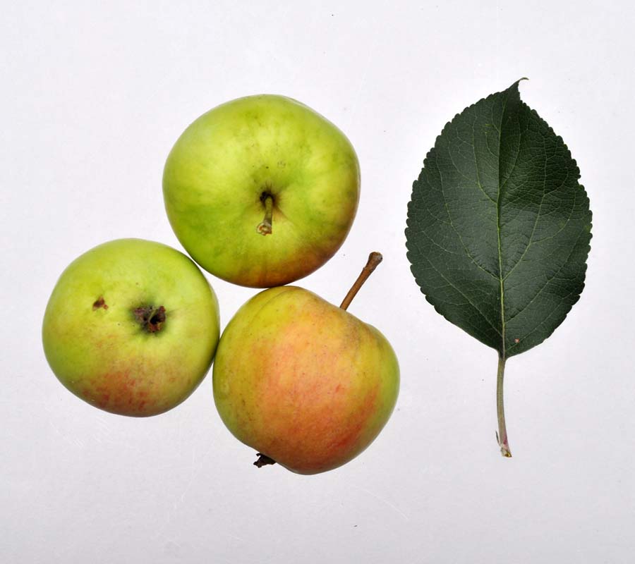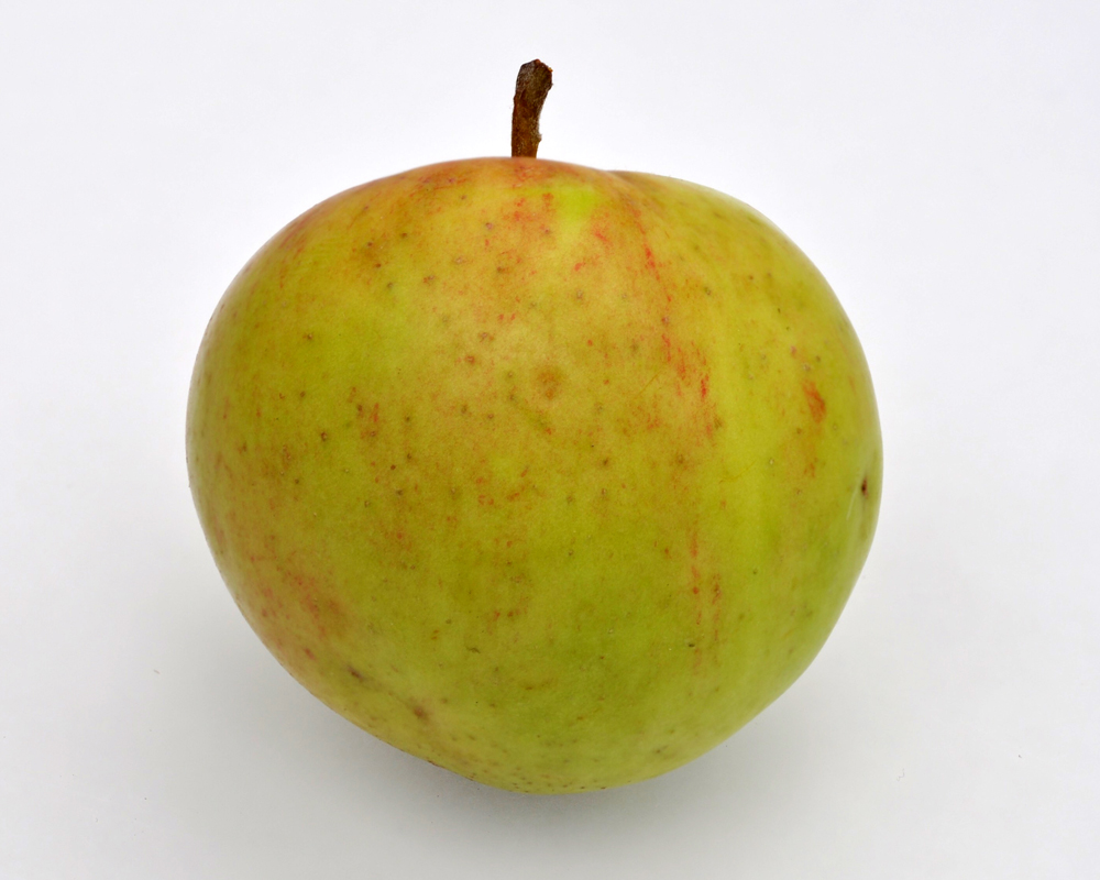 Frugten er stor, næsten kugleformet eller kegleformet, grønlig hvid med mat rødt, der ved modenhed bliver livlig rødt på skindet, der er svagt fedtet. Frugtkødet er hvidt med svagt grønligt eller rødligt skær, lidt løst, marvet, saftigt og lidt syrlig vinagtigt med svag jordbæragtig aroma. Modner i august-september.