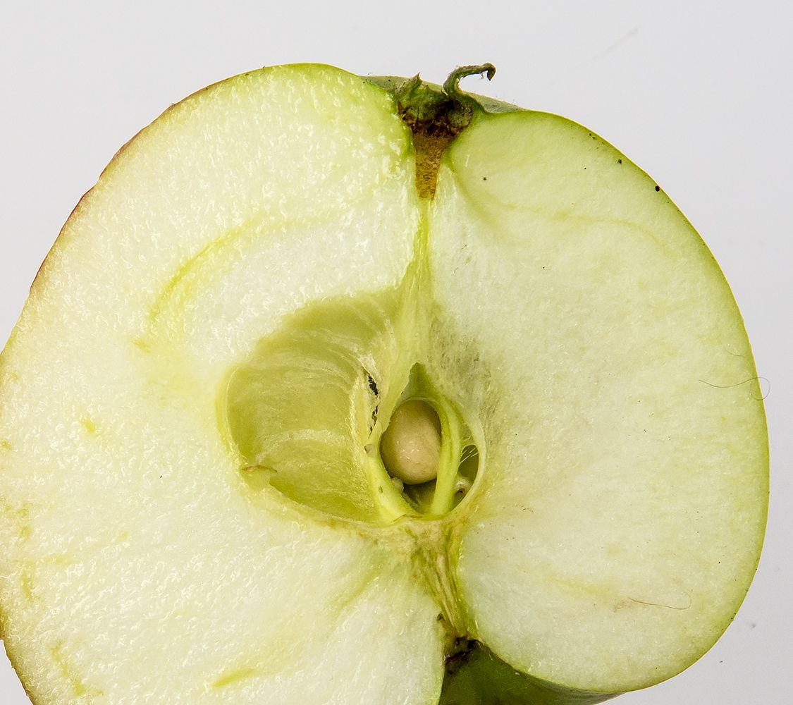 Æblet er middelstort. På ældre træer dog ofte lille og uens i Størrelse. Grundfarven bliver efterhånden hvidgrøn til hvidgul. Solbeskinnede Frugter kan få en kraftig karminrosa dækfarve. Er variabel i farven med striber og stænk. Kødet er hvidt og løst og bliver let noget tørt. Har en behagelig, sødlig smag.