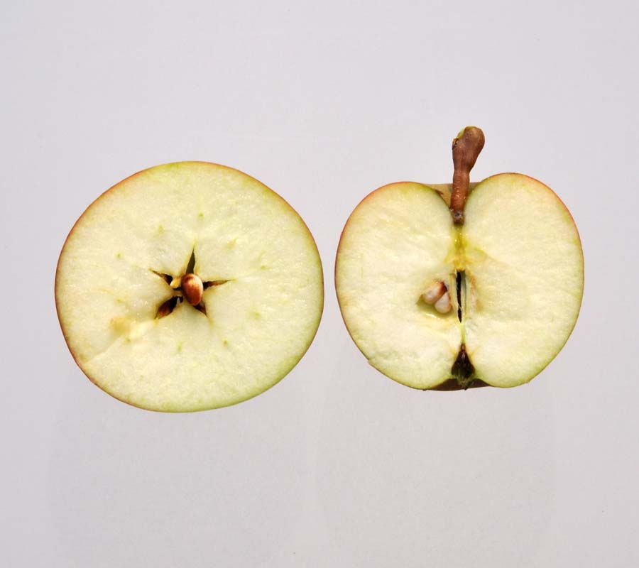 The apple is medium sized, round and regular. Yellow ground color with a clear red color. The flesh medium solid, juicy, with a nice tart sweet flavor and aroma. Vitamin C is high, so there is little tendency for browning when the apple are cut.