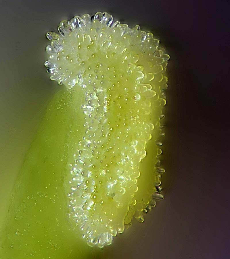 Støvfanget, der nu er bestøvet. Der kan ses pollenkorn, der spirer.